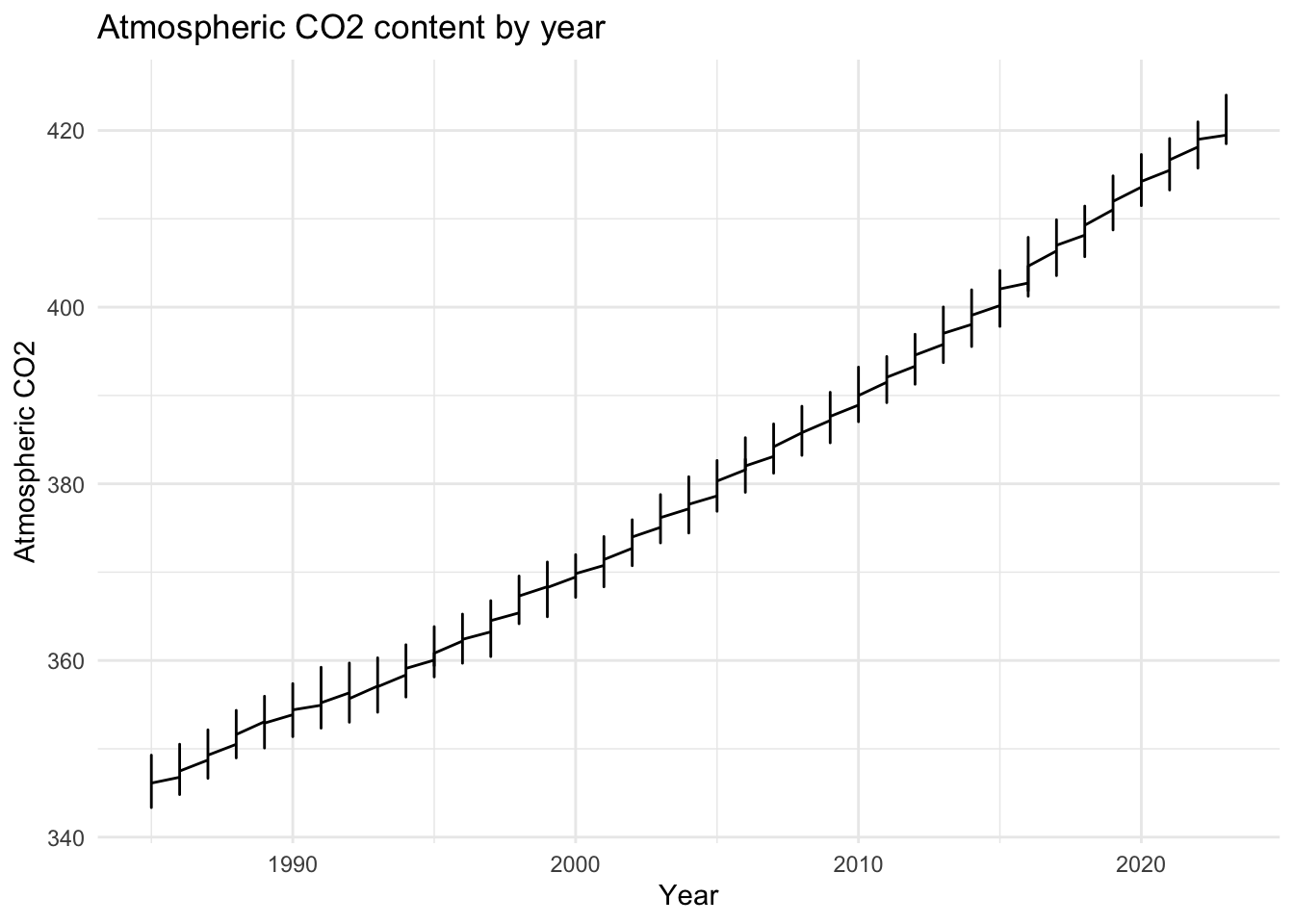 First, let’s visualize the trend of the atmospheric CO2 content over the years using ggplot.