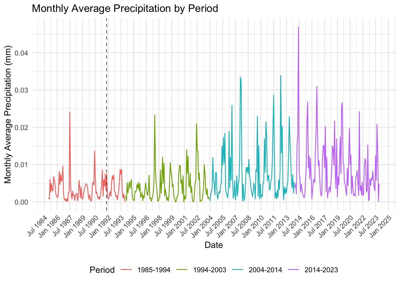ggplot(monthly_avg_combined, aes(x = year_month, y = monthly_avg_precip, color = period)) +